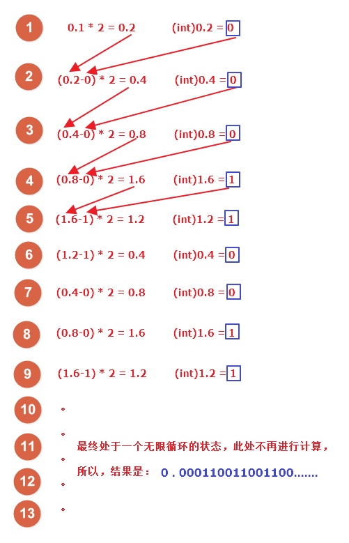 小数部分是 0.1,计算得:0.0001100110011001100………….,计算过程见下图: