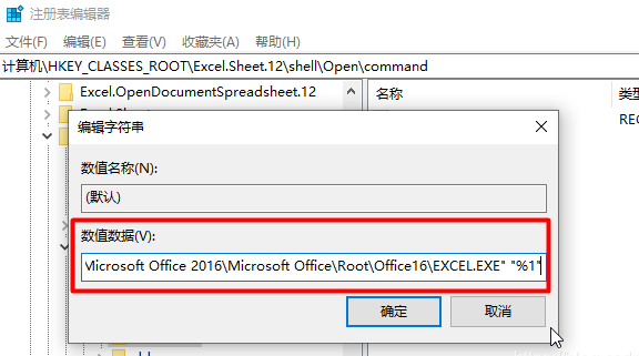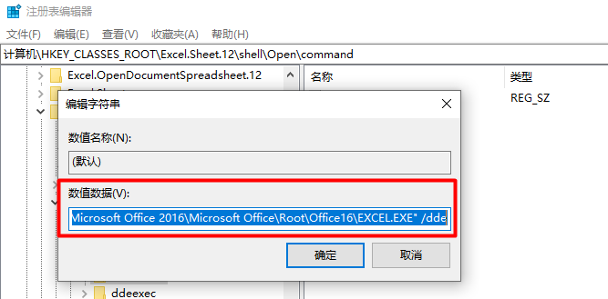 将数值数据中最后的/dde 修改为"%1" 后确定,即将"E:\SoftwareInstallation\Microsoft Office 2016\Microsoft Office\Root\Office16\EXCEL.EXE" /dde 修改为"E:\SoftwareInstallation\Microsoft Office 2016\Microsoft Office\Root\Office16\EXCEL.EXE" "%1"("%1"和前面之间有空格,双引号是英文状态的):