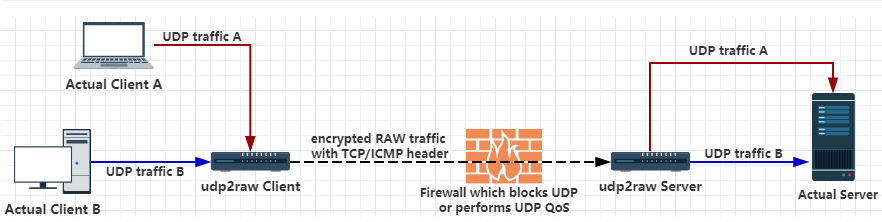 上图是大概的工作原理,看图不难理解,我们在pc上产生udp流量,但是udp流量容易受到干扰,所以我们先将udp流量给udp2raw-client ,再由udp2raw-client来将流量伪装为tcp流量再转发给udp2raw-server,然后解密校验之后来获得原来的udp流量。