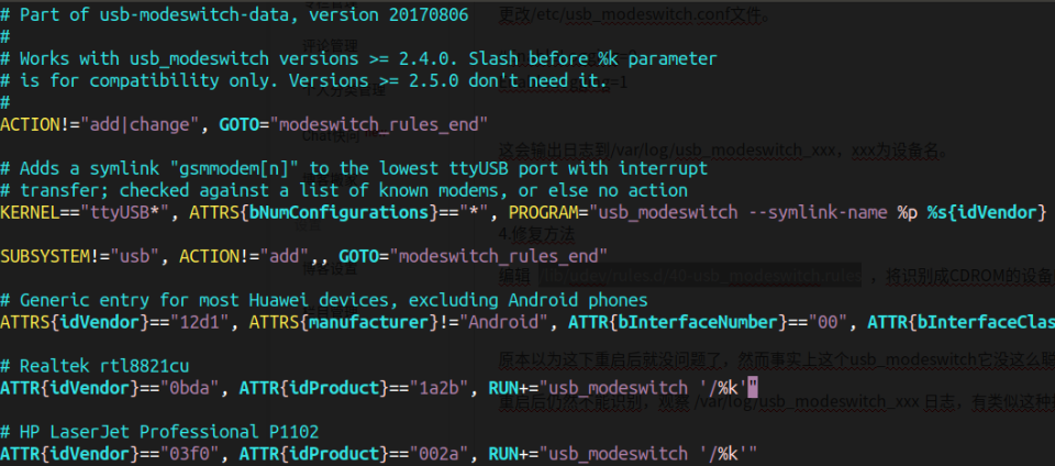 你可以通过修改配置文件来设置usb_modeswitch的参数。您可以从本文的参考链接中获取最新的版本。需要注意的是安装时你需要安装usb-modeswitch-data的包,其中包含了设备数据库和规则文件。