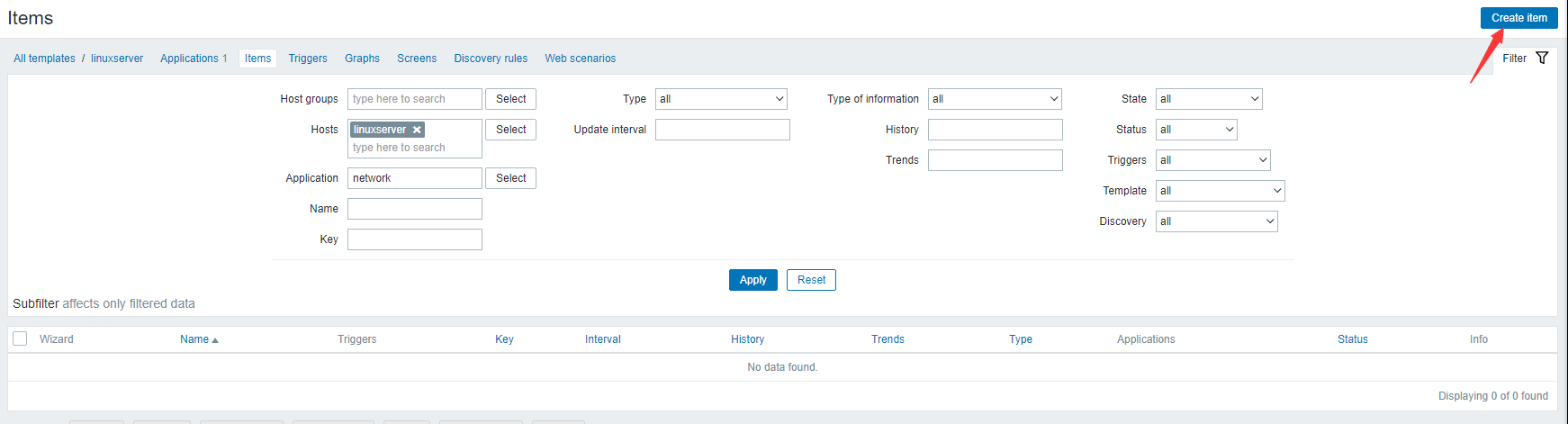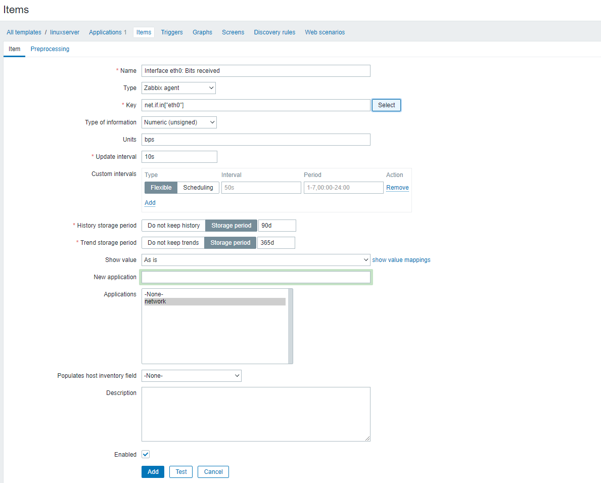 填入Item名,type默认使用zabbix agent,填入key(这里填入的key代表的是获取eth0网卡的入方向的流量,具体更多key的设置,本篇暂不讨论,具体设置与格式官网文档有),选择我们刚刚创建的应用