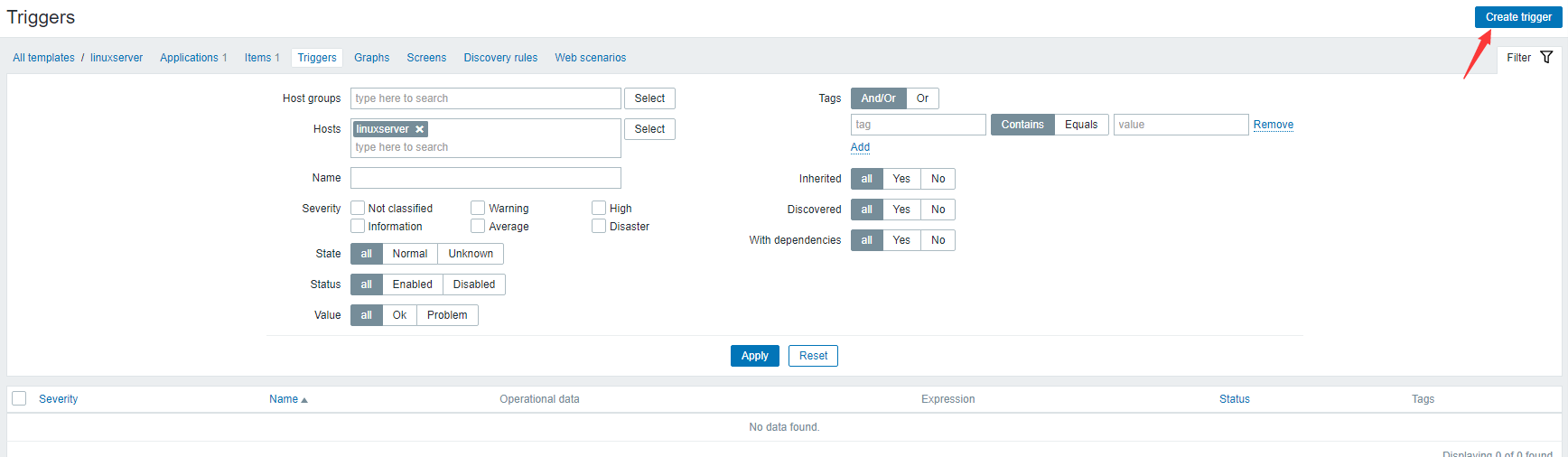 触发器是“评估”由监控项采集的数据并表示当前系统状况的逻辑表达式。可以根据自己设置创建相关的告警