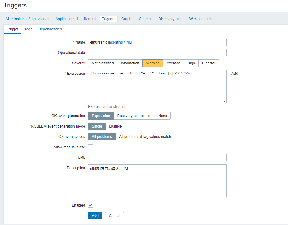 简单创建一个当eth0入方向流量大于1M的warning告警