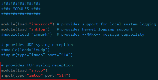 修改 rsyslog 配置文件 /etc/rsyslog.conf ,取消 TCP 或者 UDP 日志接收模块注释,下图开启 TCP514端口 接收日志