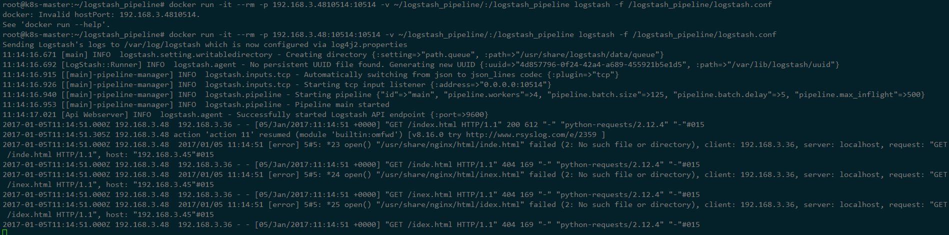 root@192.168.3.48:~# docker run -it --rm -p 192.168.3.48:10514:10514 -v ~/logstash_pipeline/:/logstash_pipeline logstash -f /logstash_pipeline/logstash.conf