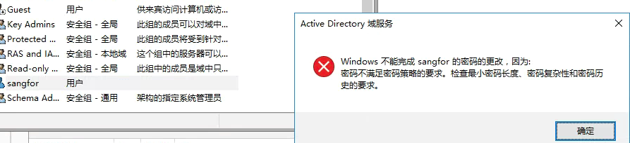 在域控中更改域用户密码时提示如下“密码不满足密码策略的要求”错误,可按照以下步骤进行密码策略修改: