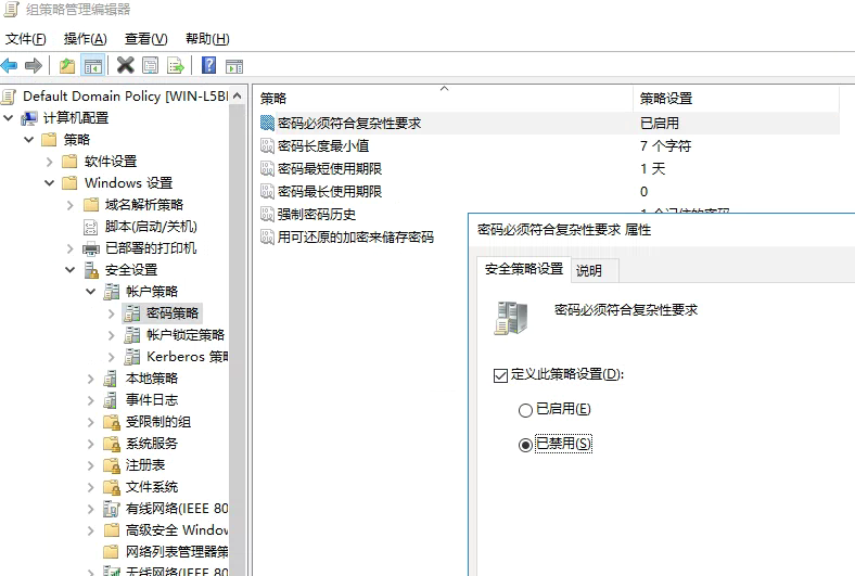 3. 根据要求调整密码策略,此处为了方便我直接禁用密码复杂度要求